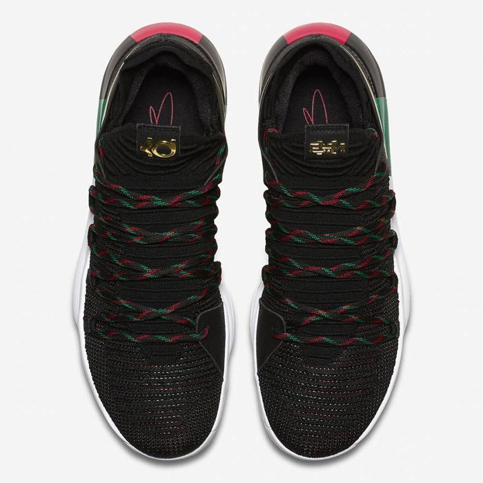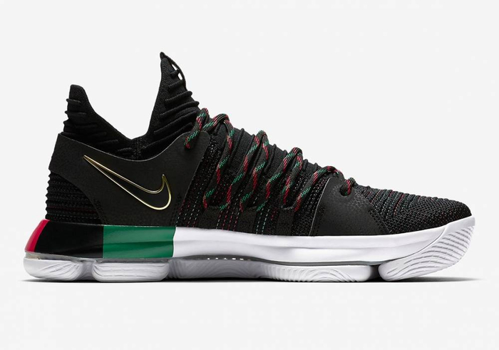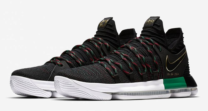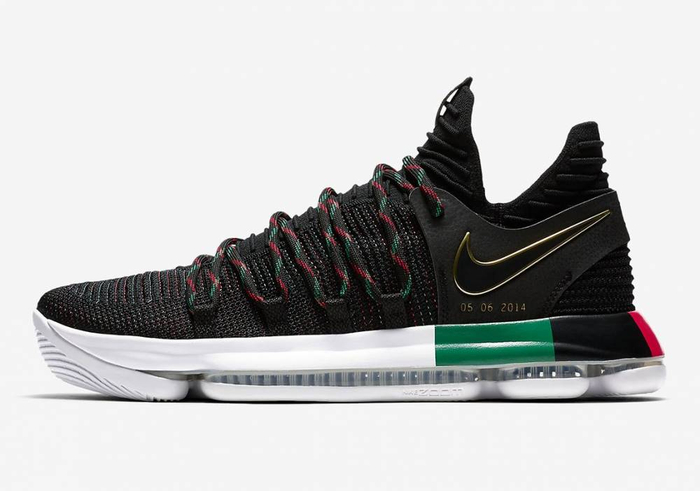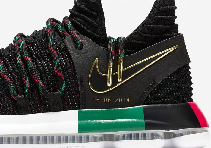 采用黑色Flyknit鞋面与金色搭配的KD 10 “BHM”版本,中底后跟部分带有泛非旗帜的绿黑红样式,值得一提的是鞋帮皮质部分Swoosh下面,用金色数字写有“05 06 2014”字样,这个日子是俄克拉荷马市的“凯文-杜兰特日”。