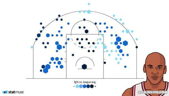 有时分跨年代纵向对比数据,其实不一定能做到公正。这样的投篮图横向一看,才干理解乔丹在当年终究有多无敌。