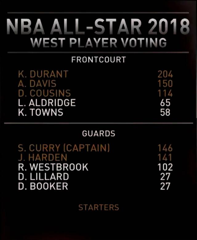 西部球员投票中,杜兰特继续领跑,浓眉哥第2位,库里第3位。