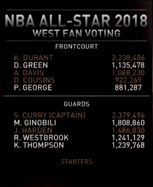 西部球迷投票中,库里得票最多(237万9494,同时是联盟第三),杜兰特第2位,吉诺比利第3位(惊喜)。