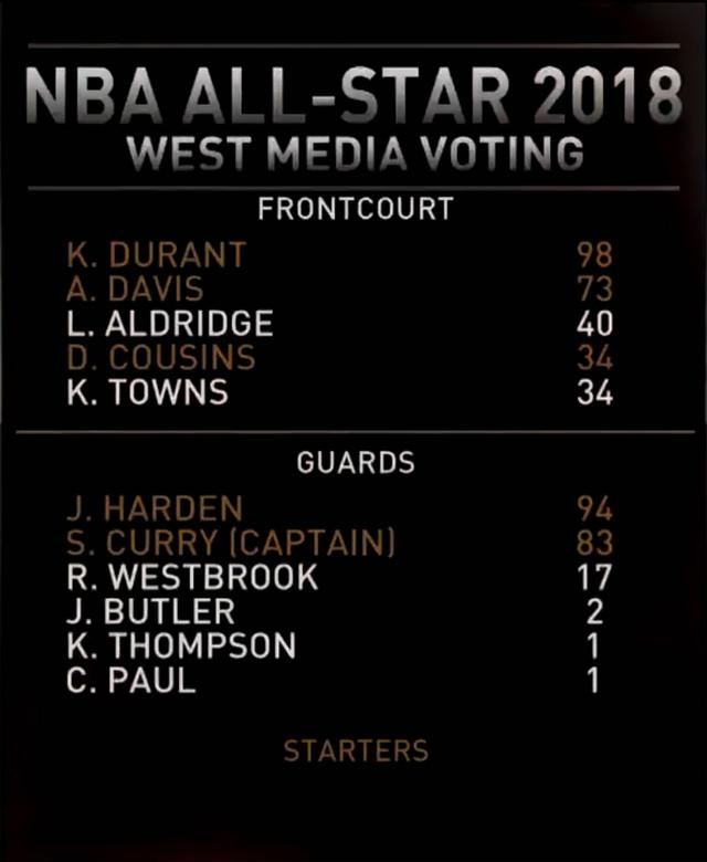 西部媒体投票中,杜兰特得票最多,哈登第2位,库里第3位。