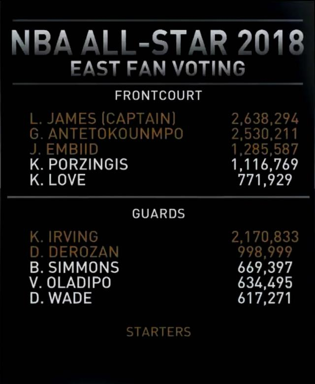 东部球迷投票中,詹姆斯得票最多(263万8294,同时也是联盟第一),字母哥第2位,欧文第3位。
