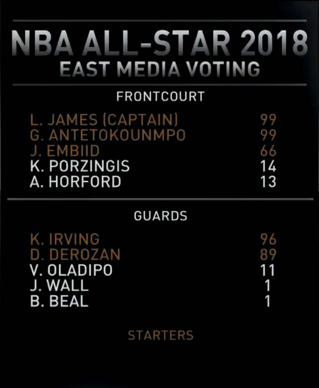东部媒体投票中,詹姆斯和字母哥并列第一,欧文第2位。