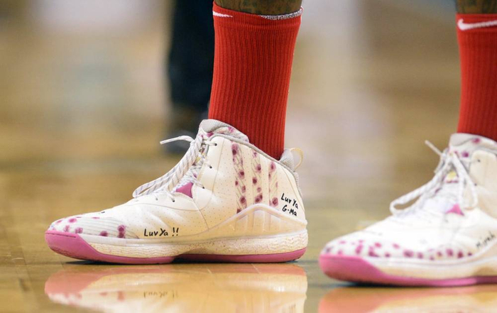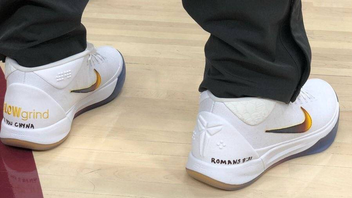 詹姆斯在球鞋上写的分别是他三个孩子的名字。