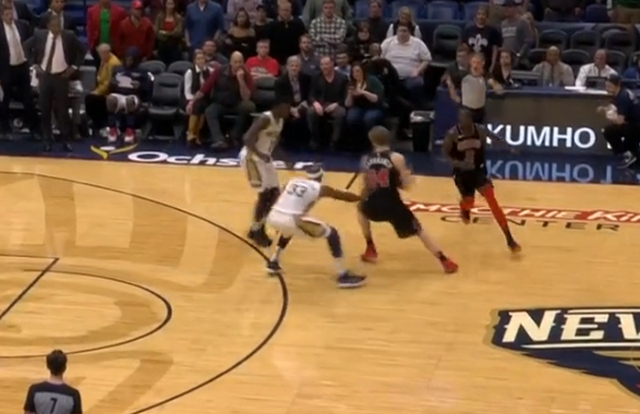 鹈鹕队少了戴维斯之后,球队就再也没有任何护筐者了。鹈鹕不能再指望弱侧协防,于是改成无限换防,上至考辛斯,下至霍勒迪,全都无限换防。