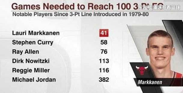 本赛季公牛得到的7号秀内线马尔卡宁在41场比赛就做到100+三分的命中数,破掉了当年新秀赛季库里58场比赛命中100+三分的历史第一纪录。现在NBA历史生涯最快命中100+三分的是马尔卡宁,米切尔的45场100+三分命中数,历史第二,库里58场比赛命中100+三分被挤到了历史第三。