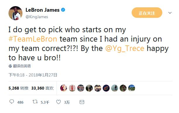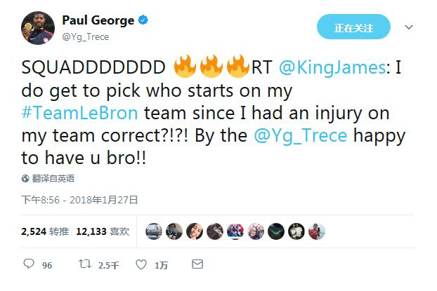 詹姆斯这个的意思就是:我是不是可以选择谁可以进我詹姆斯队的首发?好吧,恭喜你,我的兄弟。这句话被媒体解读为,詹姆斯想让保罗乔治联手他一起打首发。因为考辛斯是首发位置上的球员,他的受伤,詹姆斯有权利去寻找一个替补来顶替他的位置,而众多的替补下,或许詹姆斯真的就选择了候补的乔治了。这足以看出詹姆斯对于乔治的喜爱。而随后乔治就回复了詹姆斯的话。