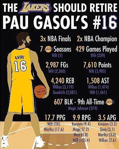 加索尔湖人生涯一共征战了7个赛季,打了429场比赛,场均贡献17.7分9.9板3.5助。共得到7610分,4240板1508助,607个盖帽。1届NBA最佳阵容二阵(2011) 、2届NBA最佳阵容三阵(2009-10) 、3进NBA全明星赛,两夺NBA总冠军。