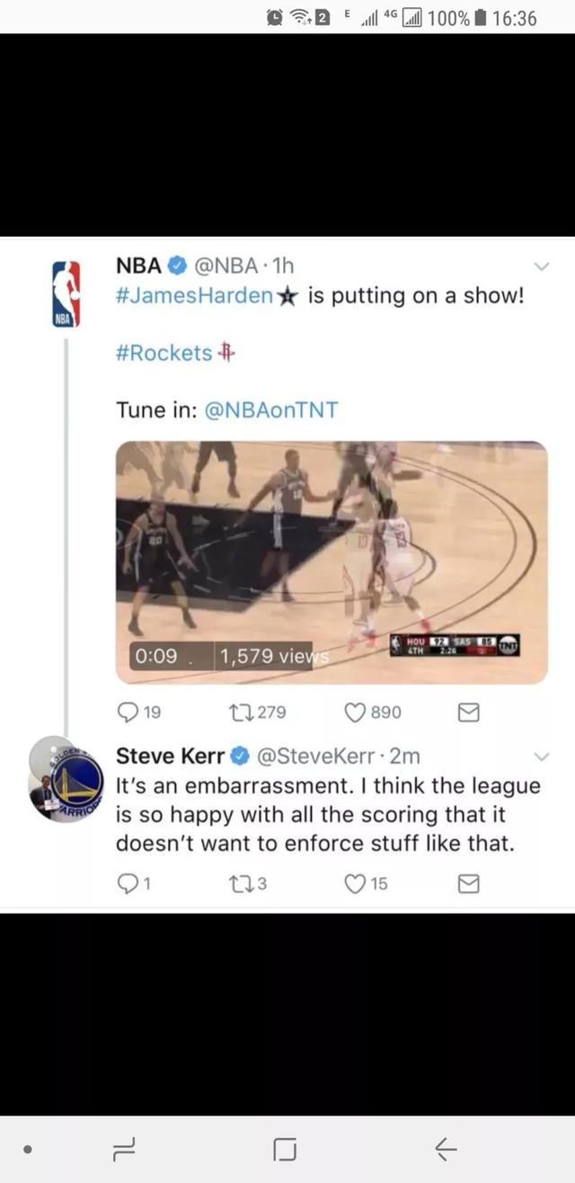 不过,勇士队的主教练科尔对此颇为不满,根据美国门户消息称:科尔认为哈登此球走步,“真是难堪啊,我认为联盟太开心见到这种进球了,所以不想吹。”当然,这些截图是网友发给门户网站的编辑者,后来科尔删除了相关的信息。