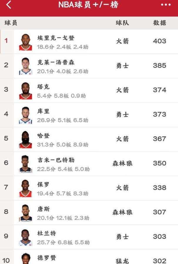 火箭的戈登高居榜首,排在第二名的是勇士的汤普森,排在第三名的是火箭队的防守悍将塔克。正负值前三甲的的球员有点让人意外,尤其是第一名让人意料不到,不过总体来说,正负值前五名的赛场表现的确美如画