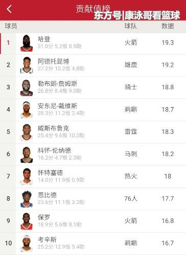 NBA贡献值榜单前五,雷霆威少第五名:18.3贡献值。鹈鹕安东尼戴维斯第四名:18.7的胜利贡献值。骑士詹姆斯第三名:18.8的贡献值。雄鹿字母哥第二名:19.2的贡献值。火箭哈登第一名:19.3的贡献值。这又是哈登的一项联盟第一,得分王、一分王(罚球)、三分王、四分王(12次3+1比NBA任何一队所有球员加起来都多),单打王、效率值之王,贡献值之王,这些都是哈登本赛季的联盟第一成绩。