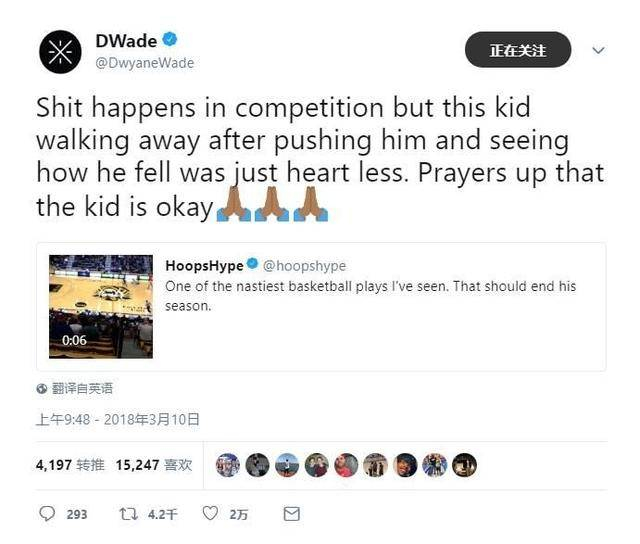 韦德等人看到后对此很不满,并迅速转发了视频:“比赛中这种行为让人恶心,犯规球员看都没看直接走开更让人心寒。希望摔倒的孩子没事。”
