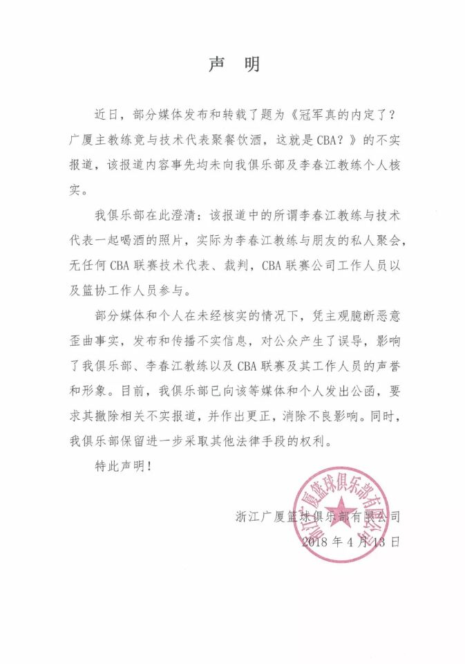 直播吧4月13日讯 CBA公司今日对网络上流传的“广厦主教练李春江抢七后宴请技术代表”的消息做出了回应。