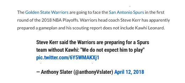 勇士在季后赛首轮对阵马刺,如果是在理想情况下,那么对于卫冕冠军来说是个非常好的对手——因为库里在首轮还要继续休养,而与此同时,他们理想中的情况下是马刺的伦纳德也不会复出。但如今问题有变,就在伦纳德极有可能在首轮复出的时候,对于勇士来说就遇到大问题了。