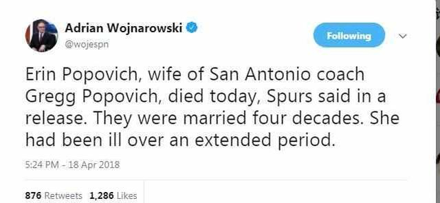 北京时间4月19日,据ESPN著名记者Woj报道,马刺队现任主教练格雷格波波维奇的妻子,艾琳波波维奇于今日去世,据悉,两人结婚至今已经40年,其妻子长时间与病痛斗争!