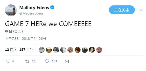 赛后雄鹿老板的女儿Mallory Edens也发推庆祝球队获得了胜利,她写道:“抢七大战我们来了。”