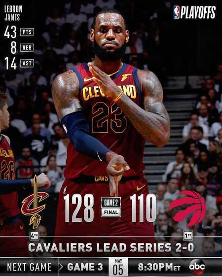 老詹完成季后赛对猛龙八连斩,骑士客场再下一城