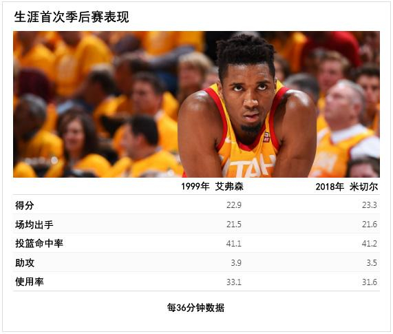 米切尔的发挥就是在整个季后赛也是效果显著的。当然,米切尔的场均数据和艾弗森相比还有些差距,但这是建立在不同出场时间之上的(艾弗森1999年季后赛场均时间在45分钟左右)。而将二人的上场时间平均到每分钟贡献的标准时,米切尔基本就是AI的2.0版本。