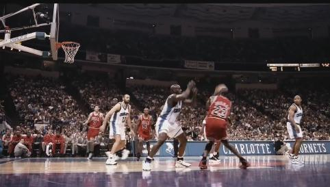 乔丹与夏洛特黄蜂的比赛中,一记后仰跳投惊艳全场。乔丹接球后先是高举皮球,试探身后的防守者,并且吸引了对手的协防。接着,乔丹运一步球,协防球员已经回去,防守球员马步扎稳准备硬抗乔丹。谁知乔丹并没有继续运球,随即一个后转身高高拔起,防守球员拼尽全力起身拦截,无奈只能成为背景板。下落过程中,乔丹依然保持着优美的投篮手型,黄蜂这五位球员只能眼睁睁的看着球应声入网。(头条不能放GIF图,请球迷担待)