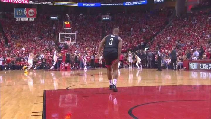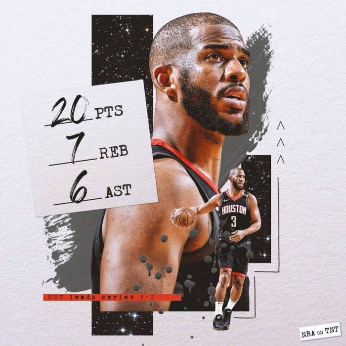 西部决赛第五场与勇士的天王山比赛中,克里斯·保罗交出了20分7篮板6助攻的全面数据。在比赛进行到第四节中段,保罗大腿拉伤被迫下场,只能看着队友们在场上与勇士肉搏。勇士最后一攻,随着格林的失误,戈登罚球命中,在比赛结束哨音吹响的那一刻,整个丰田中心彻底沸腾了,所有火箭球迷和球员都在胜利的喜悦中,保罗一瘸一拐地走进球员通道,留给观众的是一个落寞的背影!
