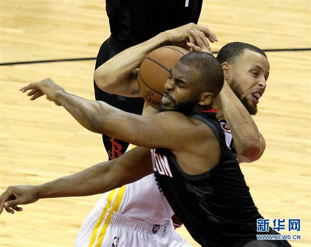 ↑5月24日,火箭队球员保罗(前)在比赛中防守勇士队球员库里。 新华社发(宋穹摄)