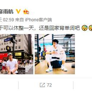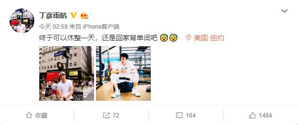 丁彦雨航配文写道:“终于可以休息一整天,还是回家背单词吧”