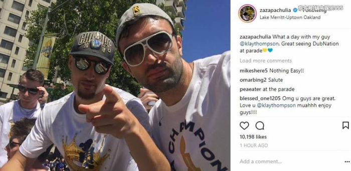 在今天的游行车队中,克莱与扎扎-帕楚里亚坐在同一辆冠军车上与球迷共同庆祝这激动人心的日子。早些时候,扎扎在ins上晒出和克莱的自拍照。“多么棒的一天,和我老兄克莱一起。很高兴在冠军游行见到勇士球迷们。”扎扎在INS上写道。