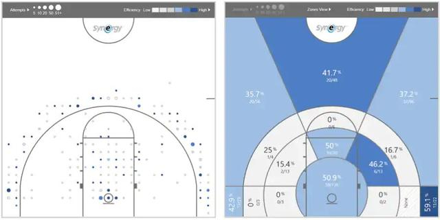 另外,小加里-特伦特通过急停跳投每回合能得0.795分,通过篮下出手每回合能得0.875分,这两项数据相对逊色,但这并非他的惯用进攻手段。他目前在进攻端的功能较为单一,缺乏为队友创造机会的能力。