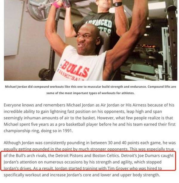 杜马斯兼具出色的个人力量和身体灵活性于一身,这就导致了乔丹在自己最擅长的突破进攻当中始终遭到杜马斯的成功拦截。也正是因为如此,乔丹开始聘请著名的训练师蒂姆-格罗弗,开始了那堪称“自我虐待”的非人训练。