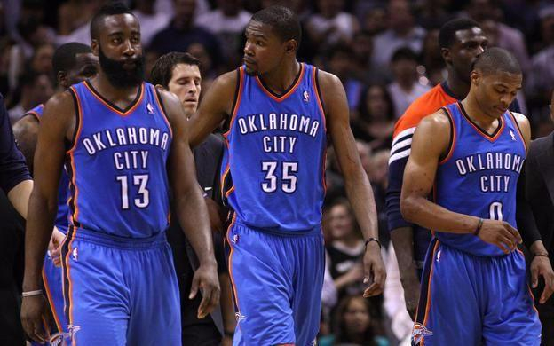 「雷霆三少」携手合作时间不过3年,他们曾在2011-12年杀进总冠军赛,最后却不敌更老练的热火三巨头。在那个赛季结束后,受制于薪资空间和球权分配问题,哈登离队转战火箭;而杜兰特也在俄克拉荷马待了9年之后,决定加入如日中天的勇士,进而开创2连霸大业。