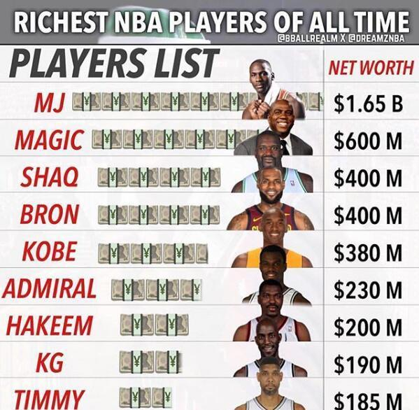 乔丹是所有NBA球员中第一位身价达到10亿美元的大佬,在球员时期他是毋庸置疑的历史第一人,退役之后他庞大的商业帝国让乔丹是赚钱如喝水般随便。乔丹品牌的球鞋每年给乔丹的分成就高达上亿美元,而且乔丹现在还是黄蜂队的大老板,目前黄蜂队的市值已经达到了十几亿美元。不仅如此,乔丹还将自己的商业版图延伸到了其他赛事,他在去年成功的成为了MLB的小老板,而MLB棒球联赛的整体收入几乎是NBA一倍之多。这几个大头让乔丹成为了十亿俱乐部的一员,而且乔丹的征程似乎才刚刚开始,不知道以后他还会创造多大的商业奇迹。