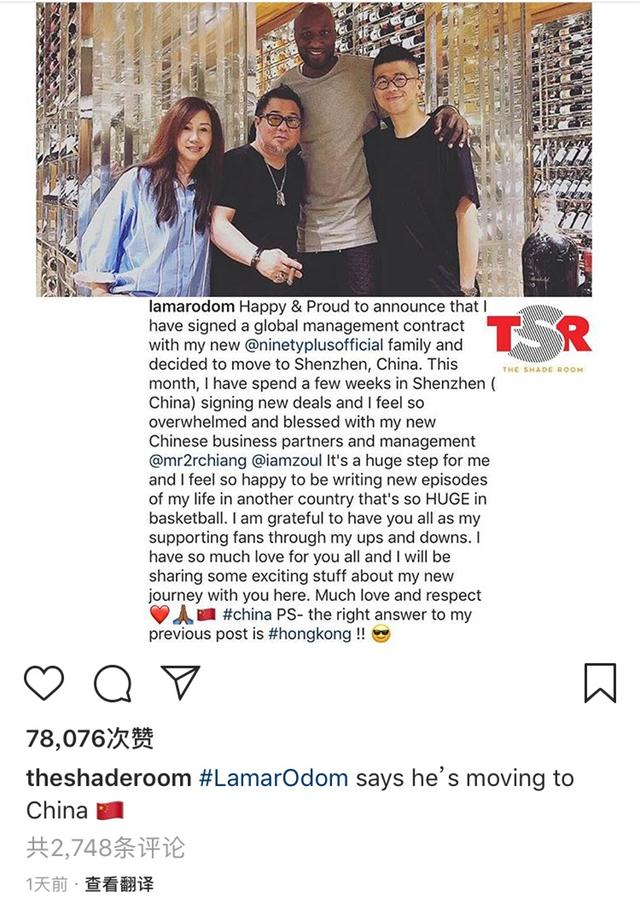 至于奥多姆的原文呢,简单说来,就是他跟一个叫@ninetyplus的中国公司签了新合同,有了新经纪人,决定搬到深圳啦。红心、合掌祈福和中国国旗的emoji,代表了大高个鸡冻的小心情~