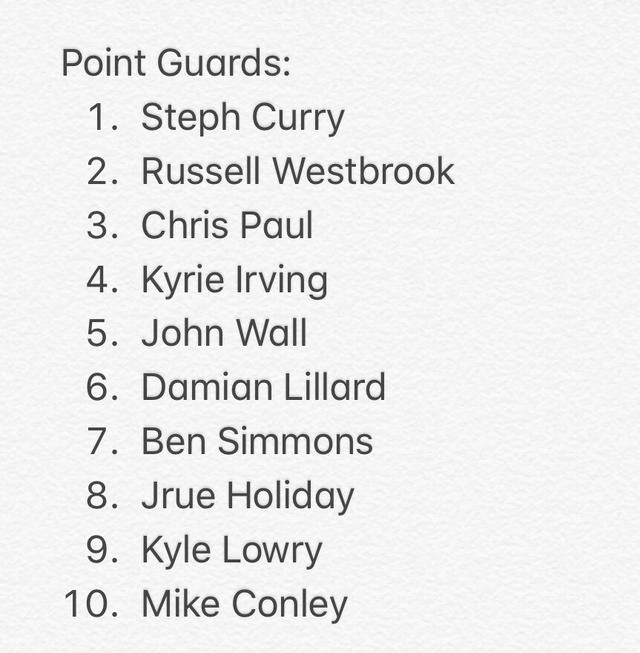 首先出炉的是后卫的评选,勇士核心斯蒂芬-库里力压上上赛季MVP得主维斯布鲁克登顶控卫排行榜。火箭指挥官保罗排在第三毋庸置疑,再往后分别是欧文,沃尔,利拉德,本-西蒙斯,鹈鹕主控朱-霍乐迪,洛瑞还有灰熊后卫康利。