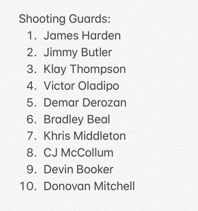 得分后卫的评选中,上赛季MVP哈登毫无悬念当选第一,这个没法反驳。森林狼主将吉米巴特勒躲下第二的宝座,而之后则分别是克莱-汤普森,奥拉迪波,德罗赞,比尔,米德尔顿,CJ-麦考勒姆,德文布克和米切尔。