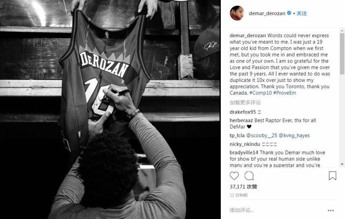德罗赞致谢多伦多:文字无法表达你对我的意义,我们初遇之时,我还是个19岁的孩子,但你接纳了我,并让我成为了你的一部分,我非常感谢过去九年里你给我的爱和激情,我唯一想做的就是以10倍的回馈来表达我的感激,谢谢你,多伦多;谢谢你,加拿大。
