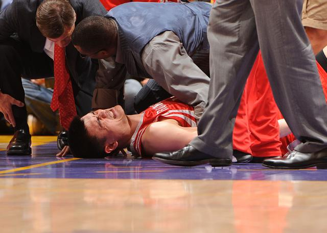 第四节还有4分50秒,火箭85-79领先湖人,在一次防守回合中,篮下的姚明被科比撞到了膝盖,这位2米26的大个子骤然倒地,双手抱着右膝,表情痛苦。火箭队医琼斯第一时间走上前去询问状况,场边的火箭主教练阿德尔曼急得像热锅上的蚂蚁。