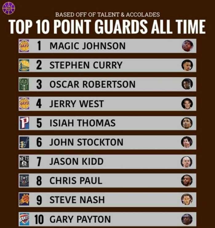 现役勇士核心控卫库里高居第二,控卫位置仅次于魔术师一人。库里堪称划时代的球星,他的三分球将NBA带入小球时代。新的时代新的主宰,库里和勇士统治了联盟,四年三冠以及其中两连冠,在库里的带领下,NBA又一球队开创了王朝霸业。目前为止,库里已经夺得三座总冠军奖杯,两座MVP奖杯(其中一次全票获得)。目前,库里场均出战34.5分钟,可以贡献23.1分4.4篮板6.8助攻1.8抢断的数据。不过,库里的排名引起不小争议声音,部分球迷认为就目前而言,库里还不够资格座在第二位置。