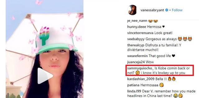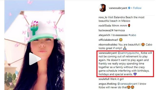 据TMZ报道,科比的妻子瓦妮莎知道她必须结束所有的谣言。她最近在Instagram上发布了一段她去墨西哥卡波旅行的视频。一位名叫“samquiocho”的用户评论了她的这段视频,并问黑曼巴是否会回到NBA,“科比会回来吗?我知道这完全取决于你。”