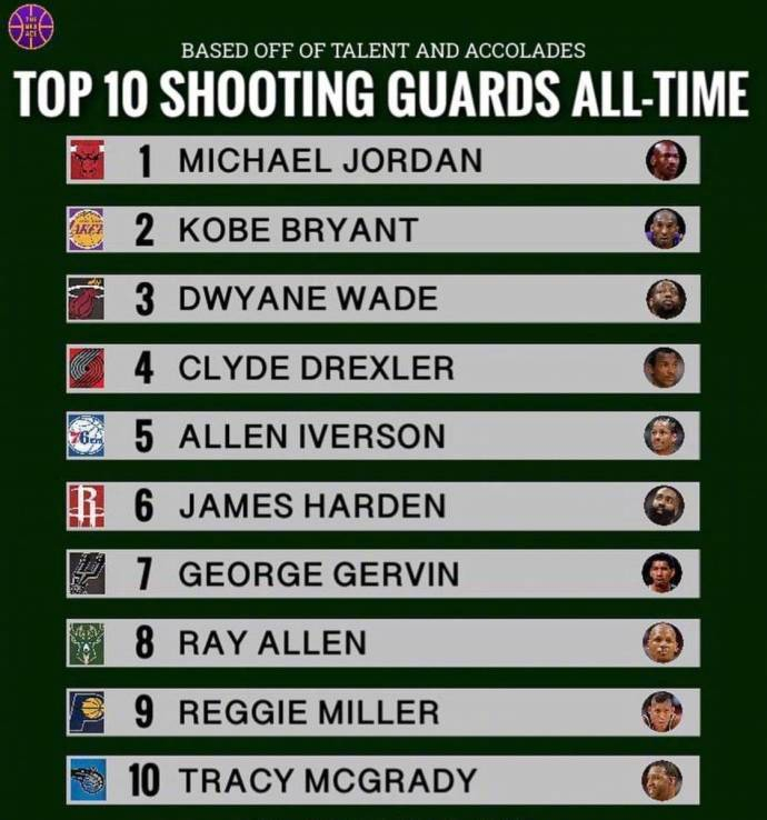 以下是美媒评选的NBA历史得分后卫TOP10: