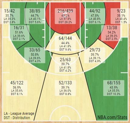 这张是cj麦克乐姆在刚刚过去那个赛季里常规赛中投篮热图的情况。这张图也更加直观的表现出cj麦克乐姆的投篮情况。在三分线顶弧附近,cj麦克乐姆一个赛季三分总共出手410次,罚球线附近出手达到了203次。在这么多出手的同时,依旧能保持着联盟平均水准甚至比联盟平均水准更好的表现,这数据也就很好的展示了CJ麦科勒姆是非常非常出色的中远距离射手。但是,如果你认为cj麦克乐姆仅仅是个射手,那么你就错了。接下来将再一次利用长篇分析,cj麦克乐姆在进攻端是怎么做的。