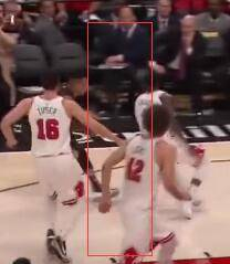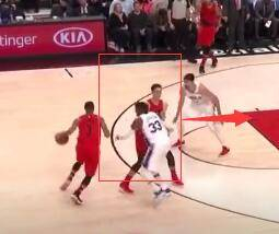 通过这张截图,可以看到,CJ麦科勒姆在做完假动作以后,靠后的脚有一个推动力,同时大家注意防守者的站位。