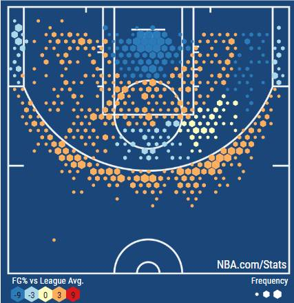 淡黄色的是接近联盟平均命中率水平,黄色越深就越比联盟水平越高。蓝色则是偏低。六边形表示的频繁程度。六边形越大表示的就越频繁。在三分线外,CJ麦科勒姆的出手相对集中在两个45°角和正90°。另一个出手相对集中的区域是罚球线附近。这也符合CJ麦科勒姆的技术特点,在稍后的文章中会继续提到。