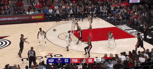 这是本赛季CJ麦科勒姆单场得到50分的比赛的首节的一段进攻。CJ麦科勒姆借掩护掩护以后面对洛佩兹并没有像其他后卫的通常选择进攻篮下,而是选择了中距离出手,这里可以看出这点非常吻合CJ麦科勒姆投篮热图的特点。肘区位置的投篮,正是CJ麦科勒姆的特点所在。