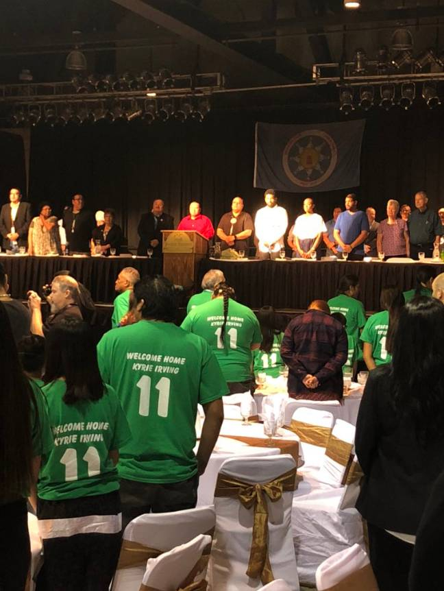 欧文已故的妈妈Elizabeth小时候被这个部落收养,所以欧文的外公外婆Standing Rock苏族的居民。欧文一直知道自己和苏族的联系和传承,欧文的球鞋NIKE N7,就是致敬苏族和他的妈妈;另外在欧文的脖子上,也有Standing Rock的纹身。主席夸“欧文没有忘记自己的根,在新赛季开始前花时间来看这边的居民,展现了欧文很好的性格并且以根基为傲”。