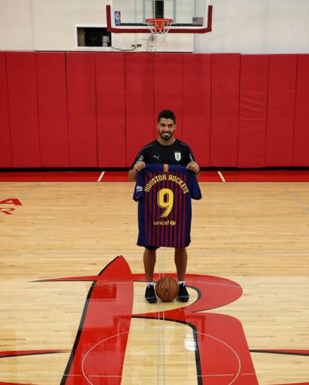 巴萨球星苏亚雷斯造访火箭 获赠9号球衣