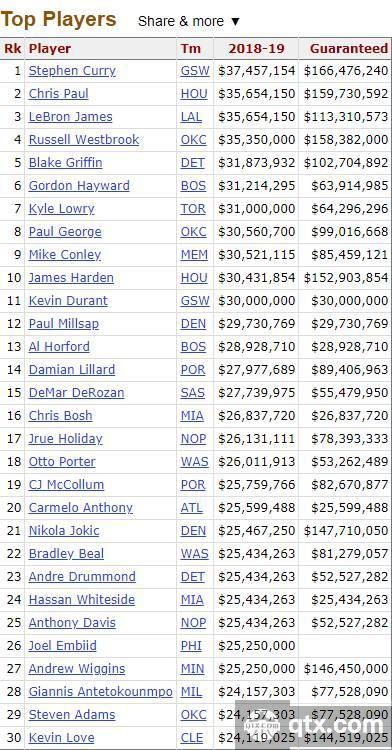 2018-2019赛季NBA球员工资排名榜 杜兰特10名开外
