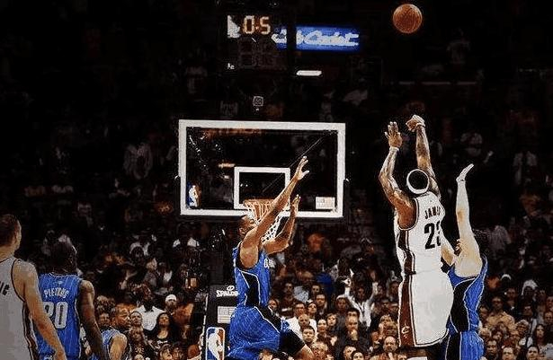 詹姆斯的绝杀时刻很多,但是若论真正震撼人心的绝杀,可能要首推他在09年时,对阵魔术的这一记三分绝杀了。当时比赛还剩一秒钟,骑士队界外球,而比分落后两分。只见勒布朗在接到队友的传球之后,就没有做什么调整,甩开特科格鲁的防守之后,就是一记弧顶三分,球出手的一瞬间时间也就只剩下了0.5秒,球落网时时间恰好走完,真正意义上的压哨绝杀。
