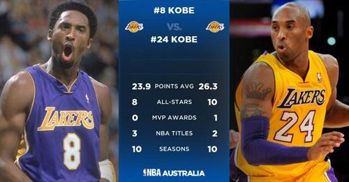 NBA球队对功勋卓著的球员,为表示缅怀之意,通常该球员退役后,将所穿球衣号码高挂于球馆之上以示纪念。至今联盟成立70年有余,唯有一人在同一球队退役了两件球衣,那便是科比。可见科比“8号时期”和“24号时期”都取得了巨大成功。在此,我们来对比一下8号和24号时期的数据、荣誉对比。