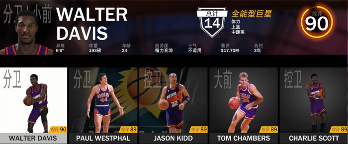 替补:丹尼斯-约翰逊(92)、凯文-约翰逊(90)、保罗-韦斯特法尔(89)、杰森-基德(89)、查理-斯科特(89)、拉里-南斯(88)、迪克-范阿斯戴尔(87)、丹-马尔利(87)、阿尔万-亚当斯(87)、德文-布克(86)