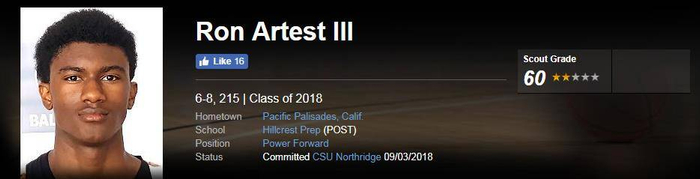 (小阿泰中投打板!)2017年阿泰斯特三世再次从比弗利高中转学去到亚利桑那州Hillcrest Prep高中(今年选秀状元艾顿的母校),虽然阿泰斯特三世已经成长很多,但基础功薄弱的他相比于五星的沙里夫仍是个两星球员。好在虽然他的技术粗糙,但是他的潜力和家庭背景让他收到了来自波特兰大学、普渡大学以及加州州立北岭分校的offer,最终他接受NCAA一级联盟的加州州立北岭分校(Cal State Northridge)的奖学金,承诺今年入学。